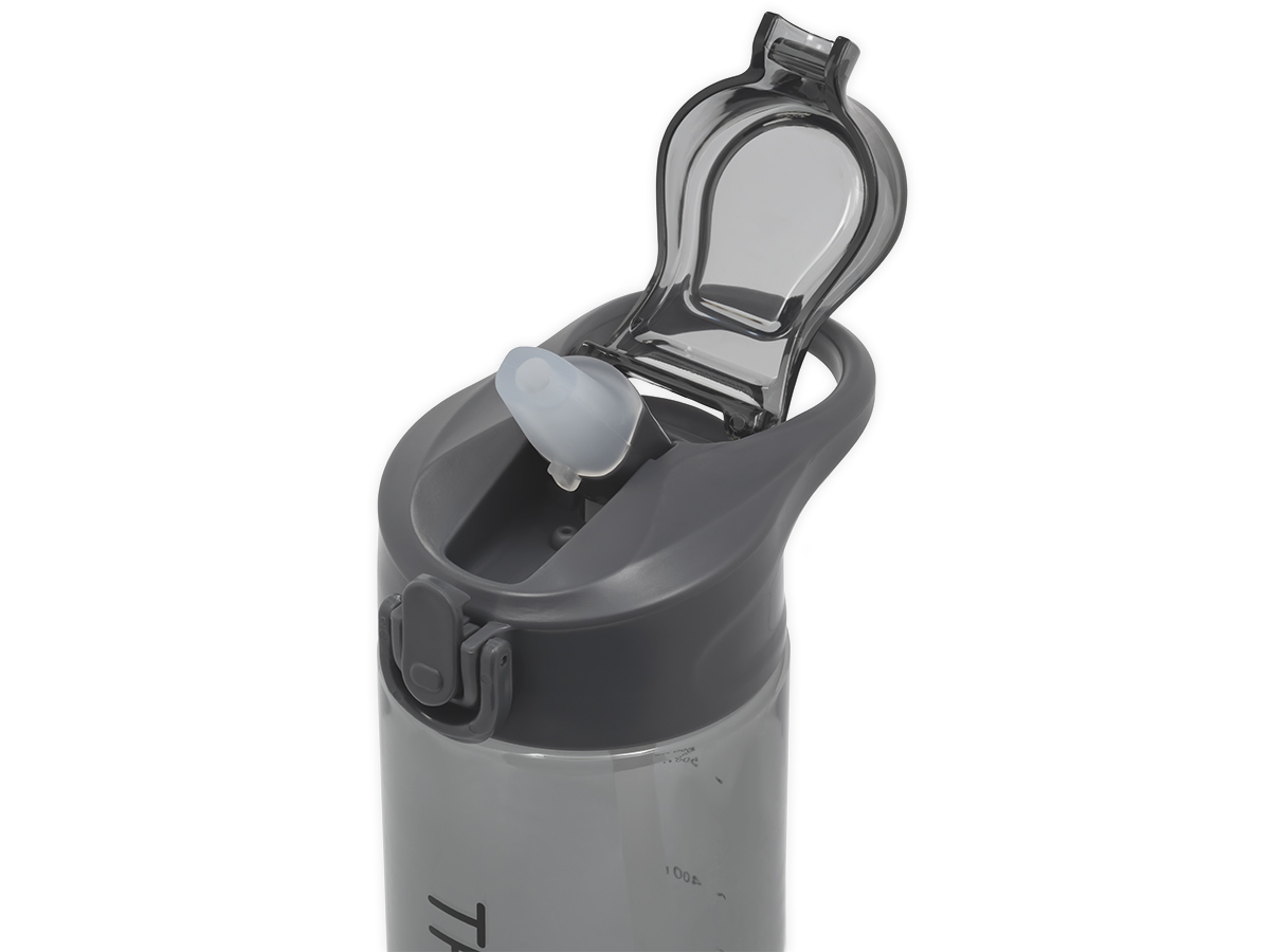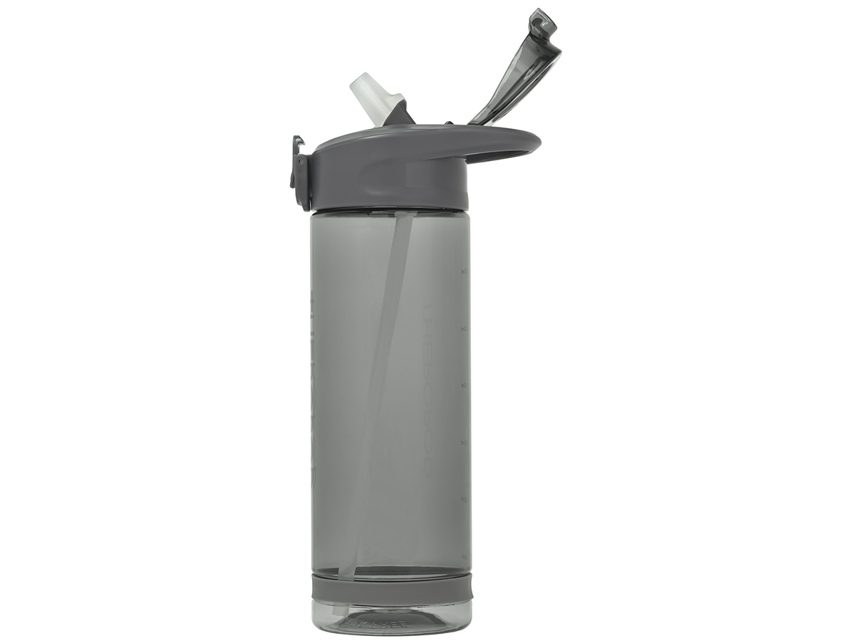 На бутылку нанесена мерная шкала, помогающая точно контролировать расход воды. Пластиковая петля на крышке позволяет удобно переносить бутылку и крепить её на сумке или рюкзаке. Силиконовое кольцо на корпусе служит для надёжного удержания.