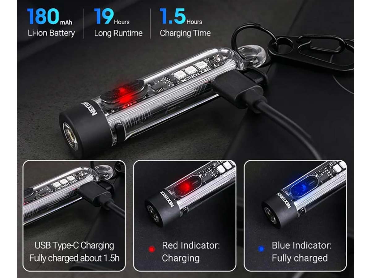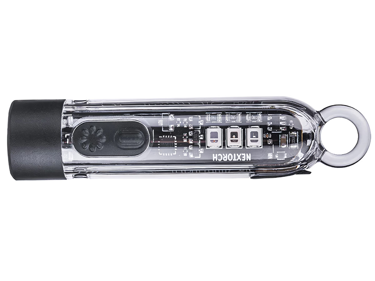 Компактный мультифункциональный фонарь-брелок Nextorch K40 Multi-light Source Keychain Flashlight включает в себя классический фонарь белого цвета с яркостью до 300 лм с режимом стробоскопа и дальностью до 78м, красно-синий сигнальный свет, ультрафиолетовый свет для проверки купюр и других задач. Всё это умещается в прозрачный компактный защищённый по стандарту IPX4 корпус со встроенным аккумулятором общей массой всего 17г, который удобно носить на ключах, пристегнуть карабином или клипсой к снаряжению.