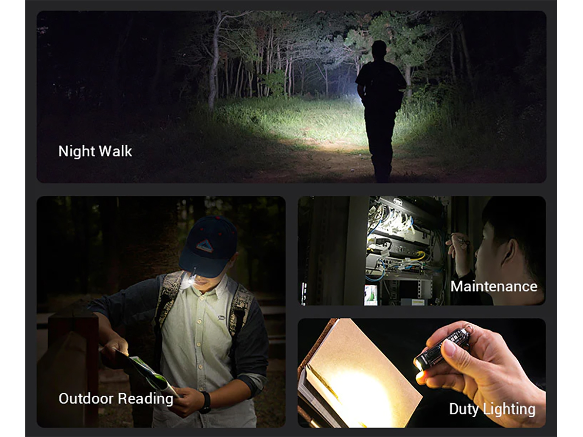 Голова фонаря с чёрным покрытием, выполнена из алюминиевого сплава. Основной свет доступен в 4-ёх режимах: 10 лм / 50 лм / 300 лм / стробоскоп. Самый яркий режим уверенно подойдёт для ночной прогулки, режимы с низкой яркостью позволяют выполнять ручные работы на близком расстоянии и экономить заряд аккумулятора.