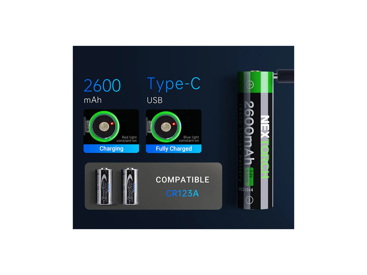 Nextorch TA30C комплектуется аккумулятором Nextorch ёмкостью 2600 мАч с разъёмом типа USB Type-C непосредственно в самом аккумуляторе, что позволяет заряжать его в любом месте, где есть USB-порт с напряжением 5В. В кнопку фонаря встроен светодиодный индикатор заряда батареи (показывает уровень заряда только для АКБ 18650).