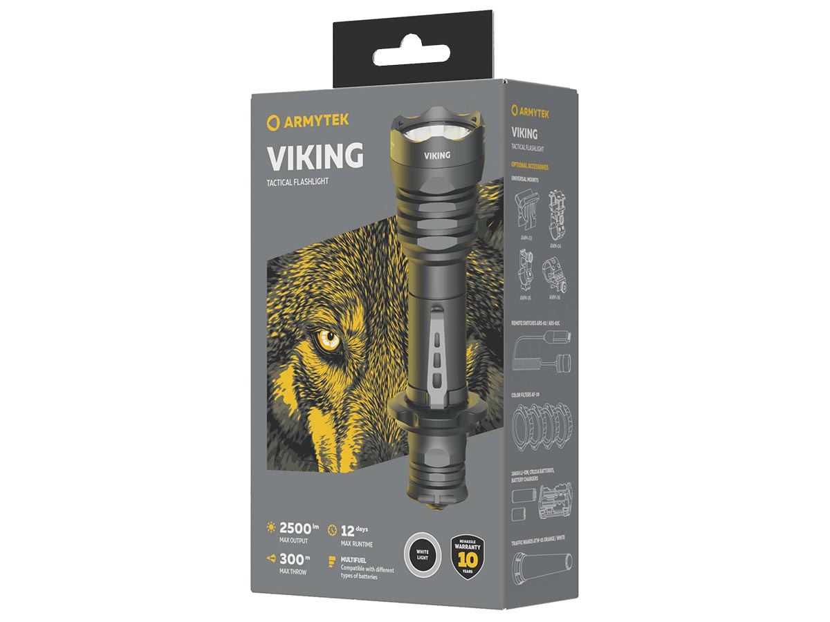Мощный тактический фонарь Armytek Viking с впечатляющей яркостью 2500 люмен и дальностью освещения до 300 метров станет вашим надёжным помощником в любых условиях — городе или пересечённой местности, благодаря широкой боковой засветке и возможности работы до 12 дней в экономичном режиме.