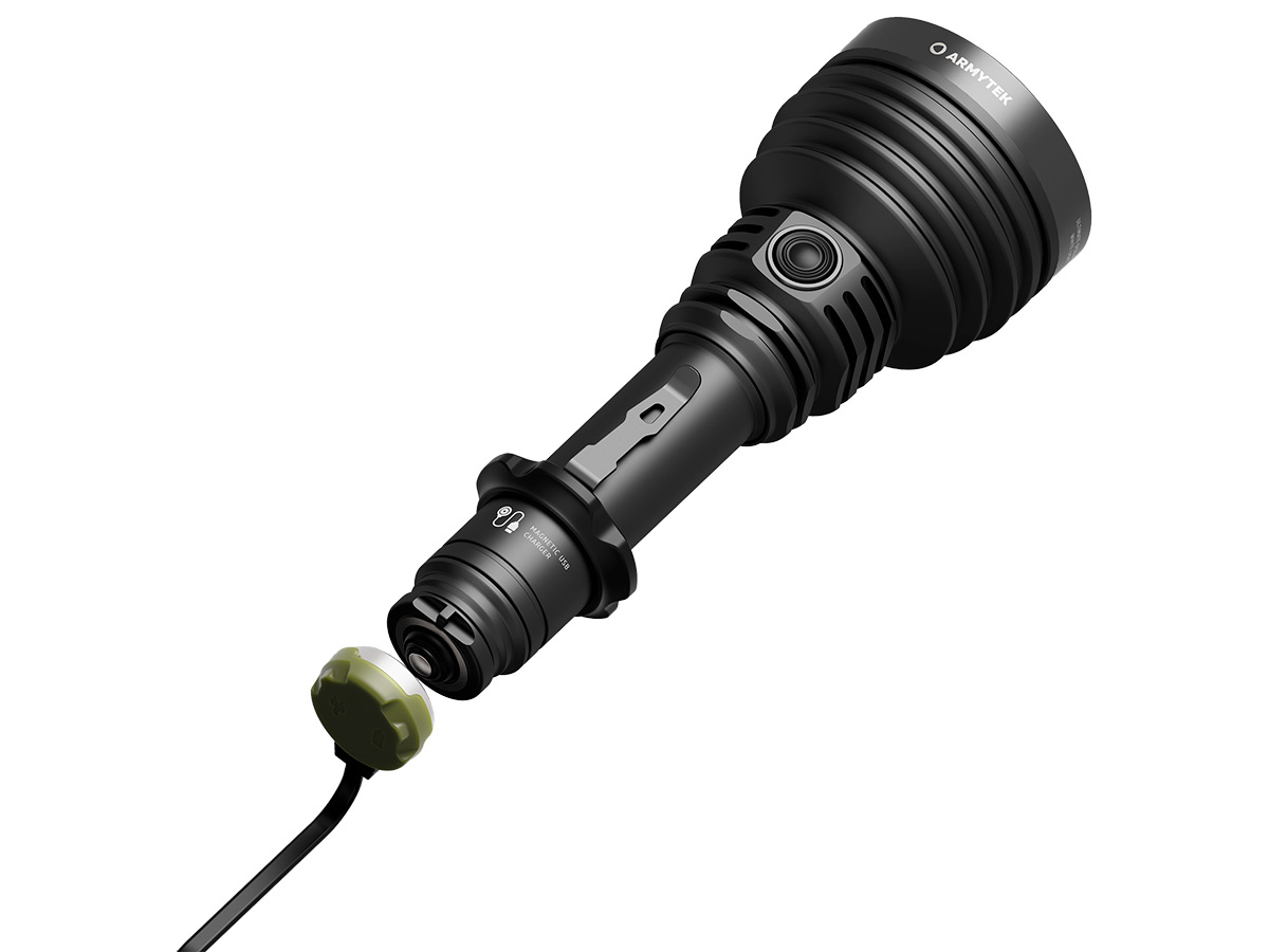 - Выпуклая двухфазная (нажатие/полунажатие) тактическая бесшумная кнопка в задней части фонаря, совмещённая с магнитной зарядкой. Срок службы кнопки в 20 раз выше механических
