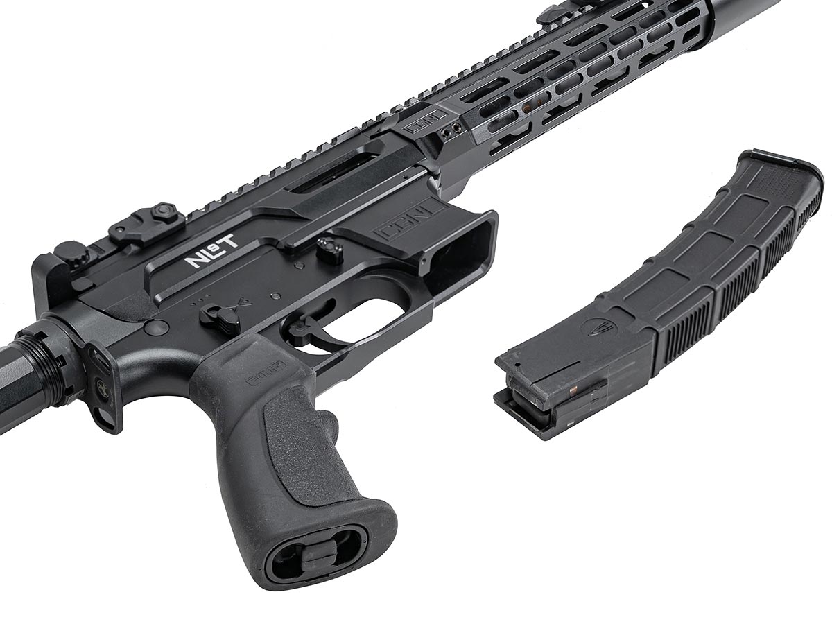 В NL9T устанавливается магазины от «Сайги-9», также на магазиноприёмник можно установить соответствующий расширитель. Кнопка извлечения такая же, как на AR-15.