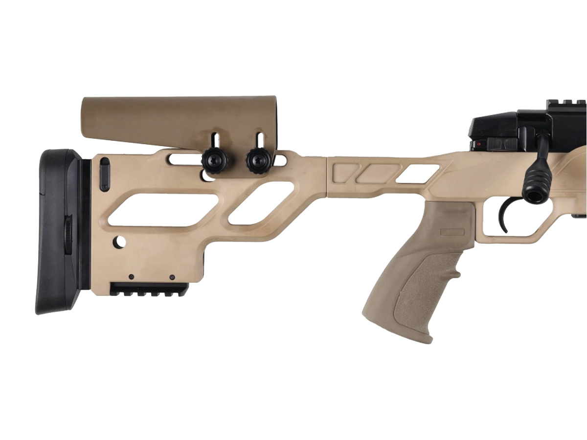 - Эргономичный регулируемый нескладной приклад выполнен из анодированного алюминия, имеет мягкий затыльник-амортизатор. Возможна регулировка длины приклада, высоты щеки, высоты и угла наклона затыльника. Направляющие регулировочных механизмов сделаны из нержавеющей стали.