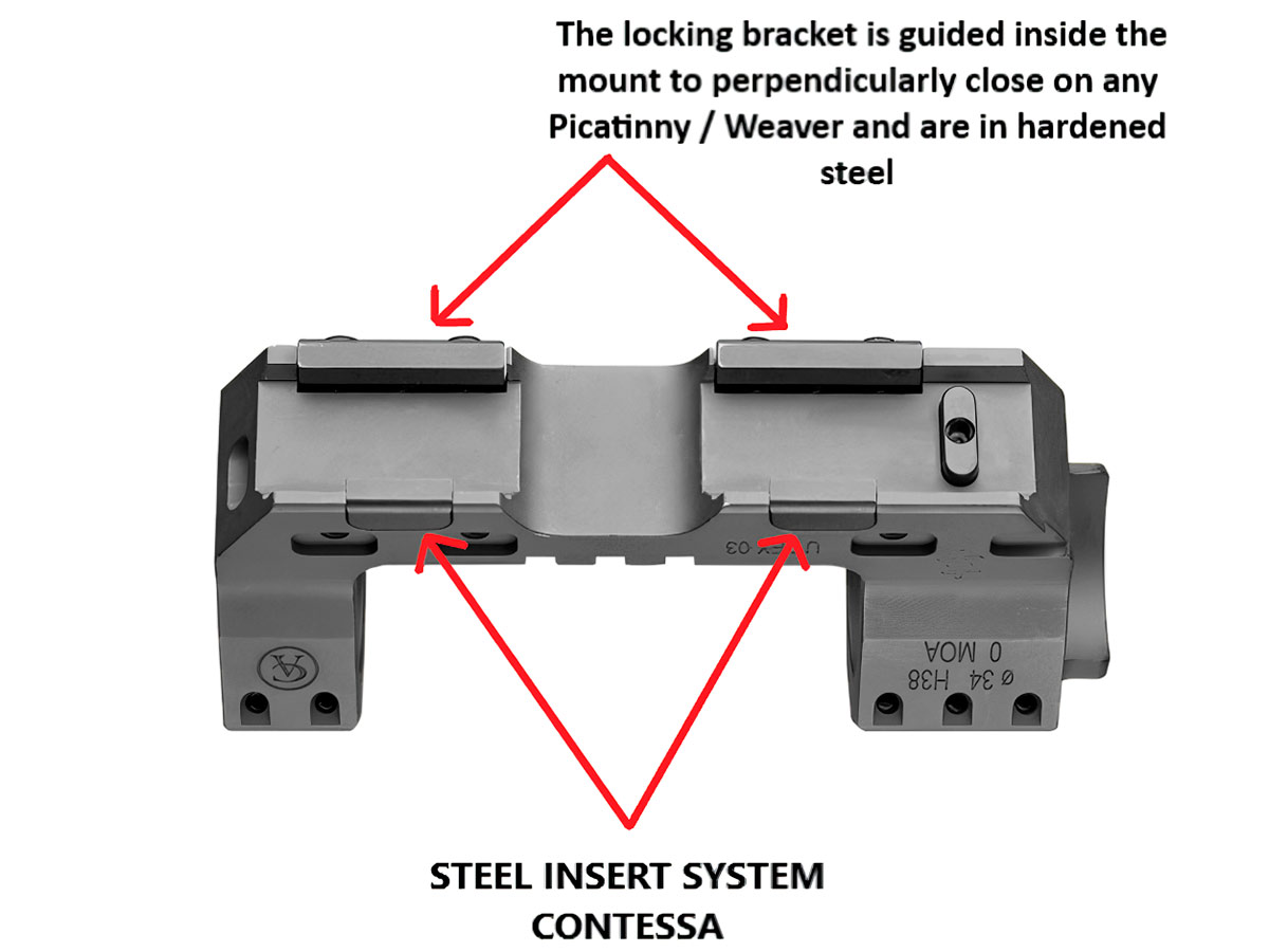 Contessa Ultra Tactical изготовлен из высококачественного алюминиевого сплава 7075, а крепёжные элементы выполнены из легированной стали с применением технологии Contessa Steel Insert System, что гарантирует стабильность и прецизионную точность сохранения выверки после снятия-установки кронштейна. Кольца не закрывают барабанчики ввода поправок и линию горизонта для удобства стрельбы.