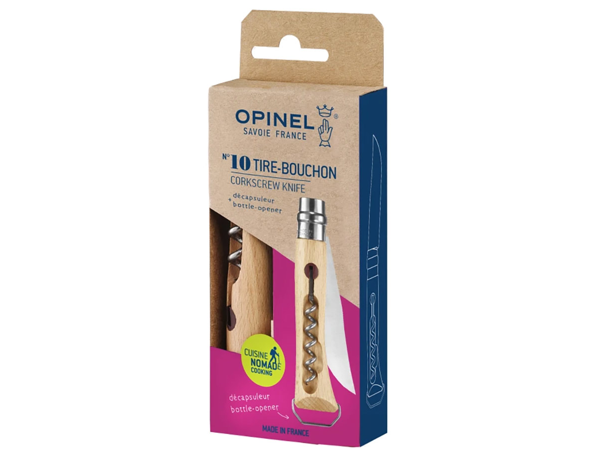 Нож складной Opinel Corkscrew Bottle Opener №10 New со штопором и открывашкой, клинок 10см, нержавеющая сталь, бук