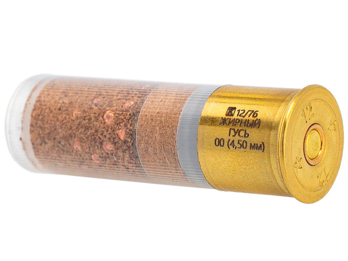 Патроны 12/76 дробь №00 (40г) Техкрим Жирный Гусь предназначены для стрельбы из гладкоствольного оружия 12 калибра с патронником не менее 76мм. В патронах используется омеднённая твёрдая дробь. Патроны 12/76 имеют более густую осыпь по сравнению с 12/70 за счёт большего количества дроби.