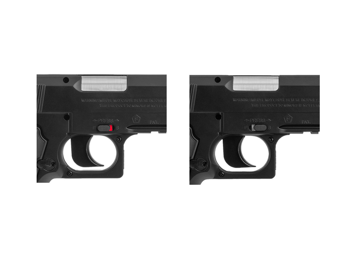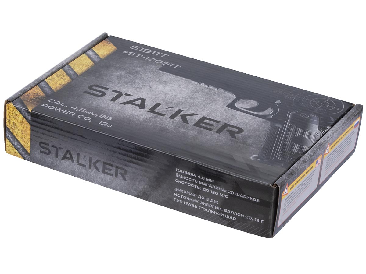 Рамка пистолета и неподвижный затвор сделаны из прочного пластика, а магазин, вмещающий 20 шариков, из металла. Безопасность при обращении со Stalker S1911T обеспечивает двухпозиционный предохранитель, расположенный с правой стороны. Кнопка сброса магазина находится с левой стороны.