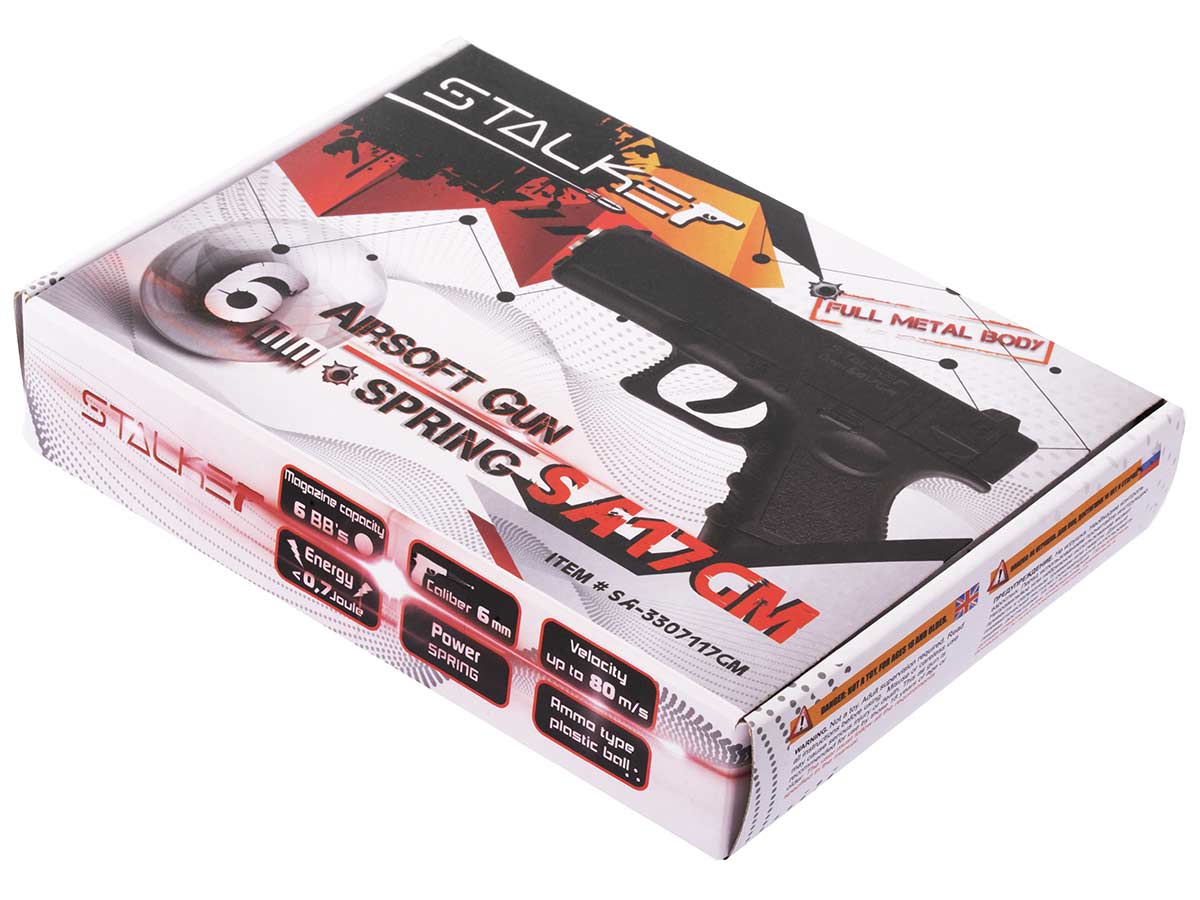 Пневматический пистолет Stalker SA17GM, входящий в пружинно-поршневую серию SPRING, создан на основе известного австрийского пистолета Glock 17 третьего поколения. Это уменьшенная версия пистолета, своим внешним видом похожая на боевой прототип. Имеет дульную энергию менее 0,7 Джоулей, поэтому не является оружием, что позволяет приобретать его без каких-либо лицензий и разрешений.