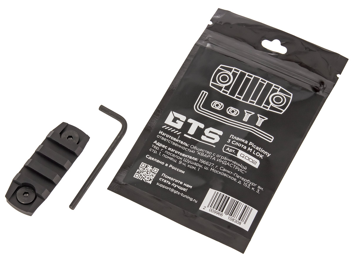 Планка Picatinny GTS Q.002 предназначена для размещения в слотах M-LOK оборудования с посадочным местом Picatinny. Устанавливается с помощью двух закладных и винтов к ним, входящих в комплект. Планка изготовлена из высокопрочного авиационного алюминия Д16T и имеет 3 слота.