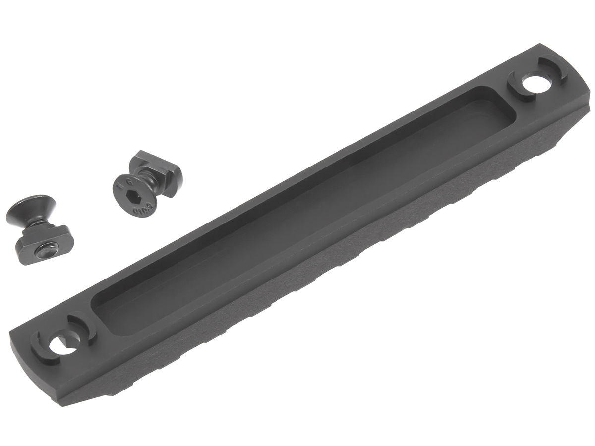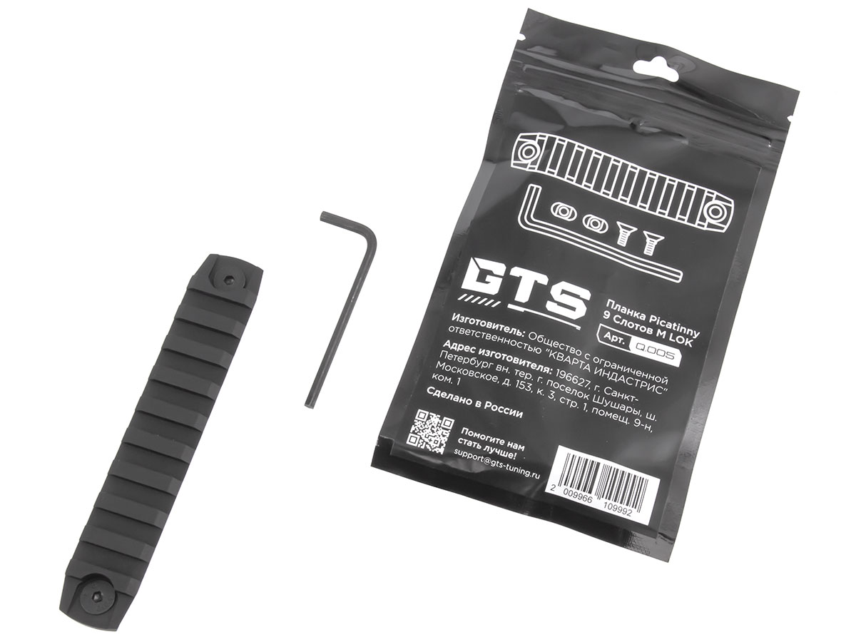 Планка Picatinny GTS Q.005 предназначена для размещения в слотах M-LOK оборудования с посадочным местом Picatinny. Устанавливается с помощью двух закладных и винтов к ним, входящих в комплект. Планка изготовлена из высокопрочного авиационного алюминия Д16T и имеет 9 слотов.