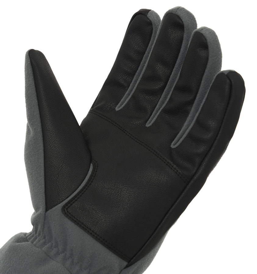 Варежки-гибрид из мембранного полотна с показателями: влагозащита 5000, паропроницаемость 5000 и дополнительной пропиткой верхнего слоя DWR, с утеплителем и усилением из искусственной кожи в области ладоней.