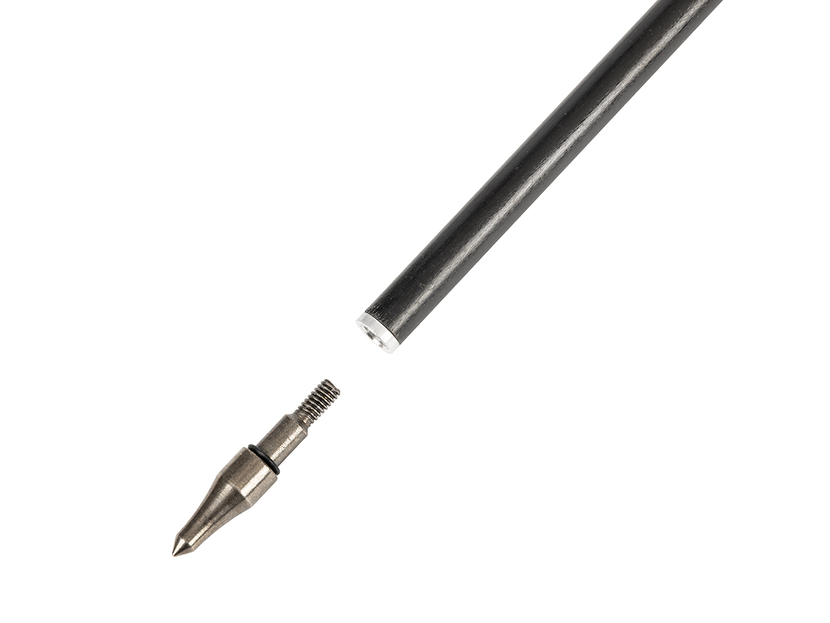 Сменный наконечник спортивного типа изготовлен из стали. Вкручивается в инсерт, имеет стандартную лучную резьбу и может быть легко заменён на любой другой, в том числе охотничий.