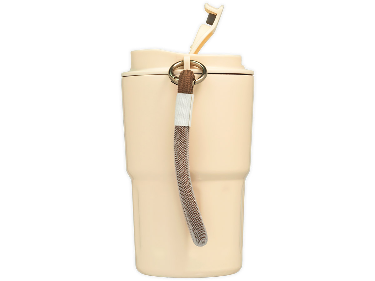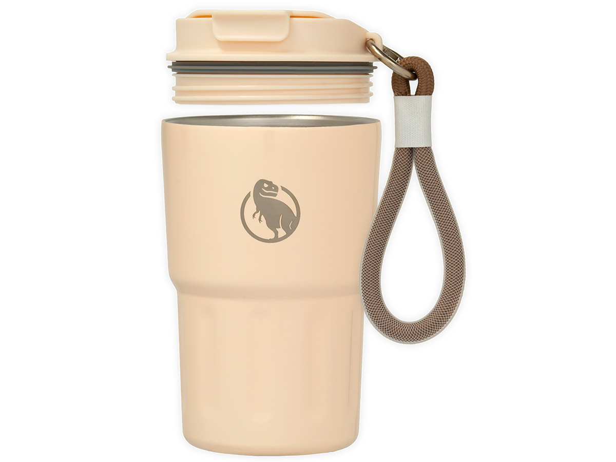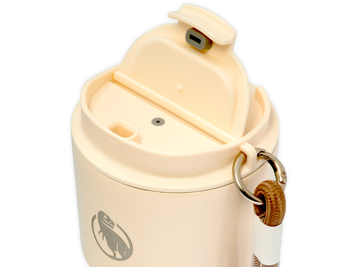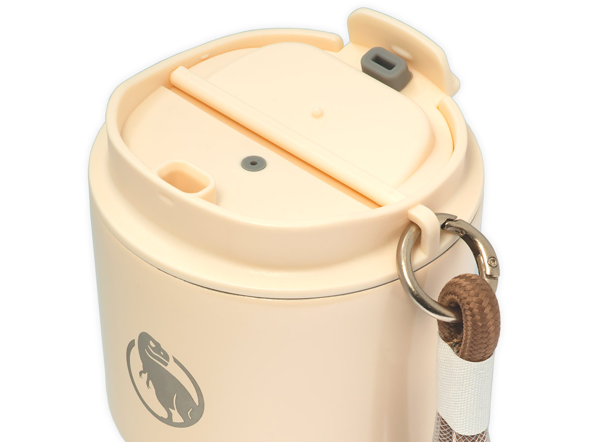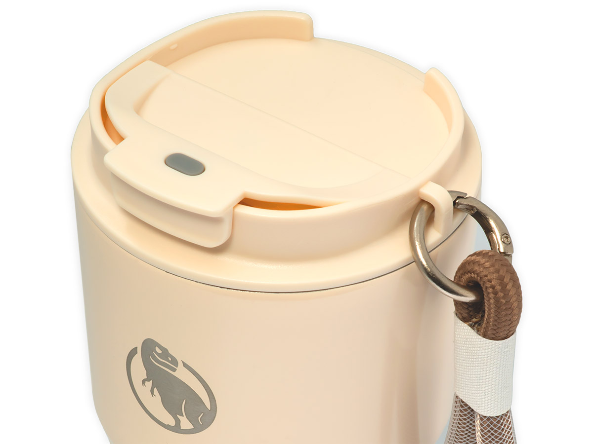 На крышке, с помощью круглого металлического карабина, закреплён прочный ремешок для ношения и подвеса. За счёт широкого горлышка термокружка проста в уходе – её легко мыть.