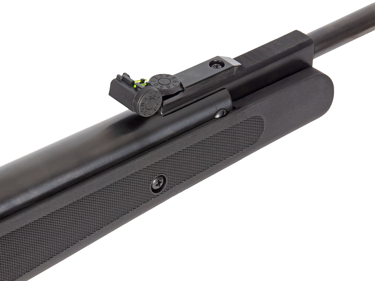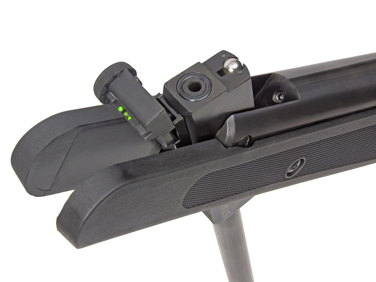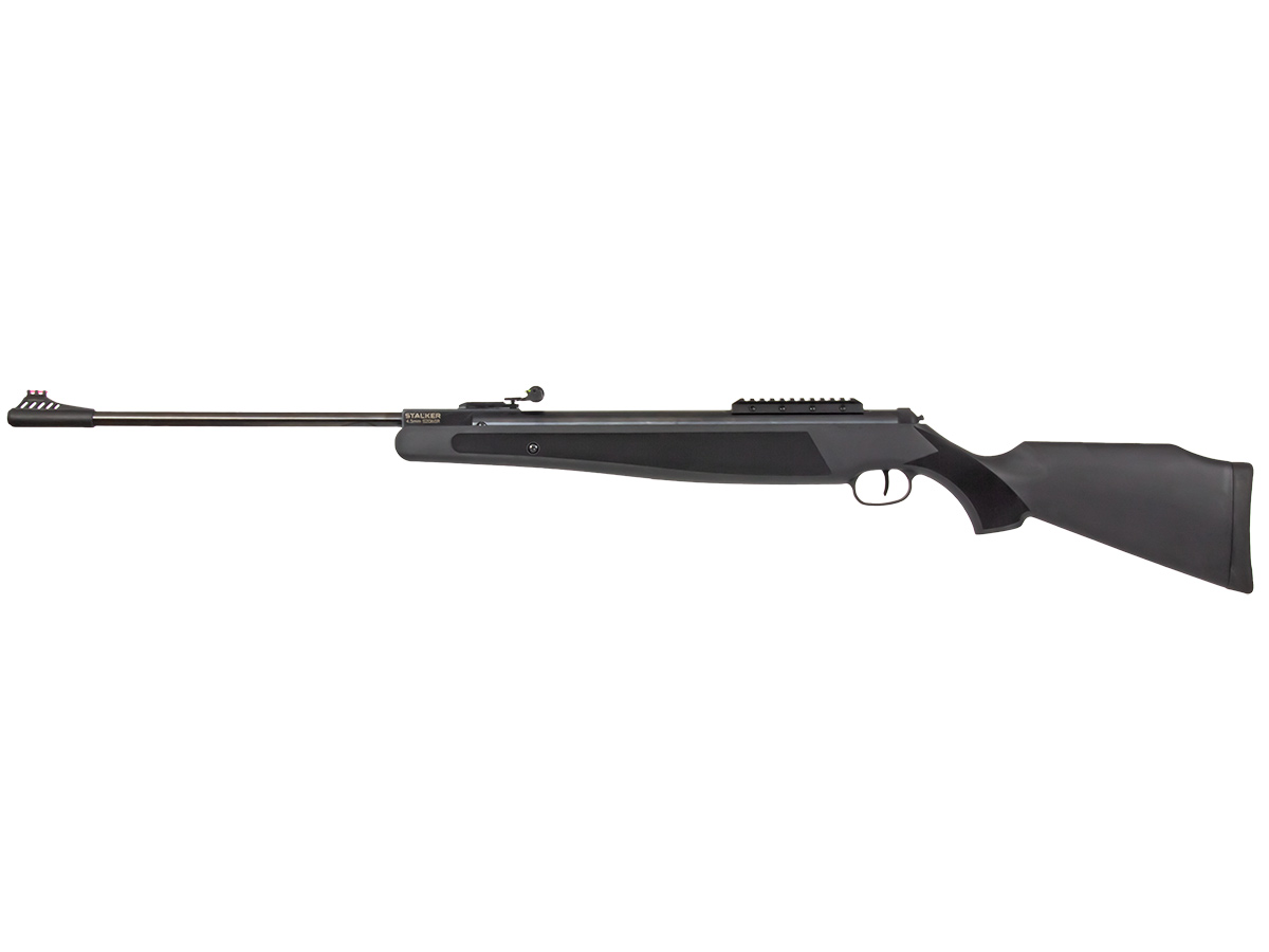Пневматическая винтовка Stalker имеет открытые прицельные приспособления — неподвижную мушку и регулируемый целик с фибероптическими элементами, улучшающими прицеливание при плохой видимости. С помощью двух барабанчиков ввода поправок целик может регулироваться по горизонтали и вертикали.
